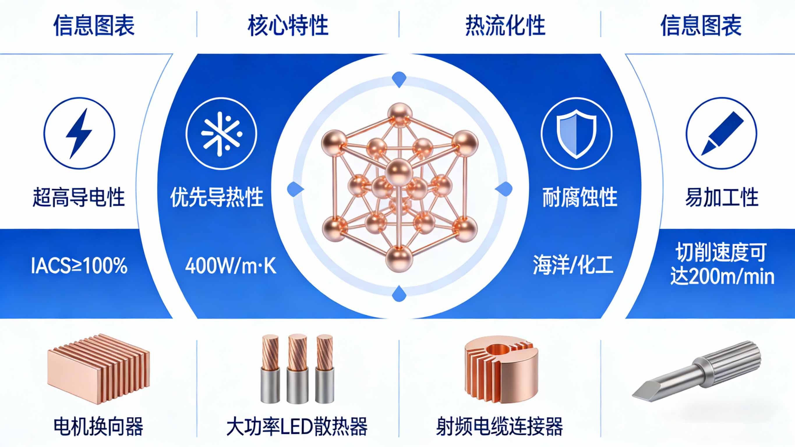 特性: 含铜量99.9%以上,导电率可达100%-101% IACS,导热系数约390W/m·K。材质较软,延展性较佳。