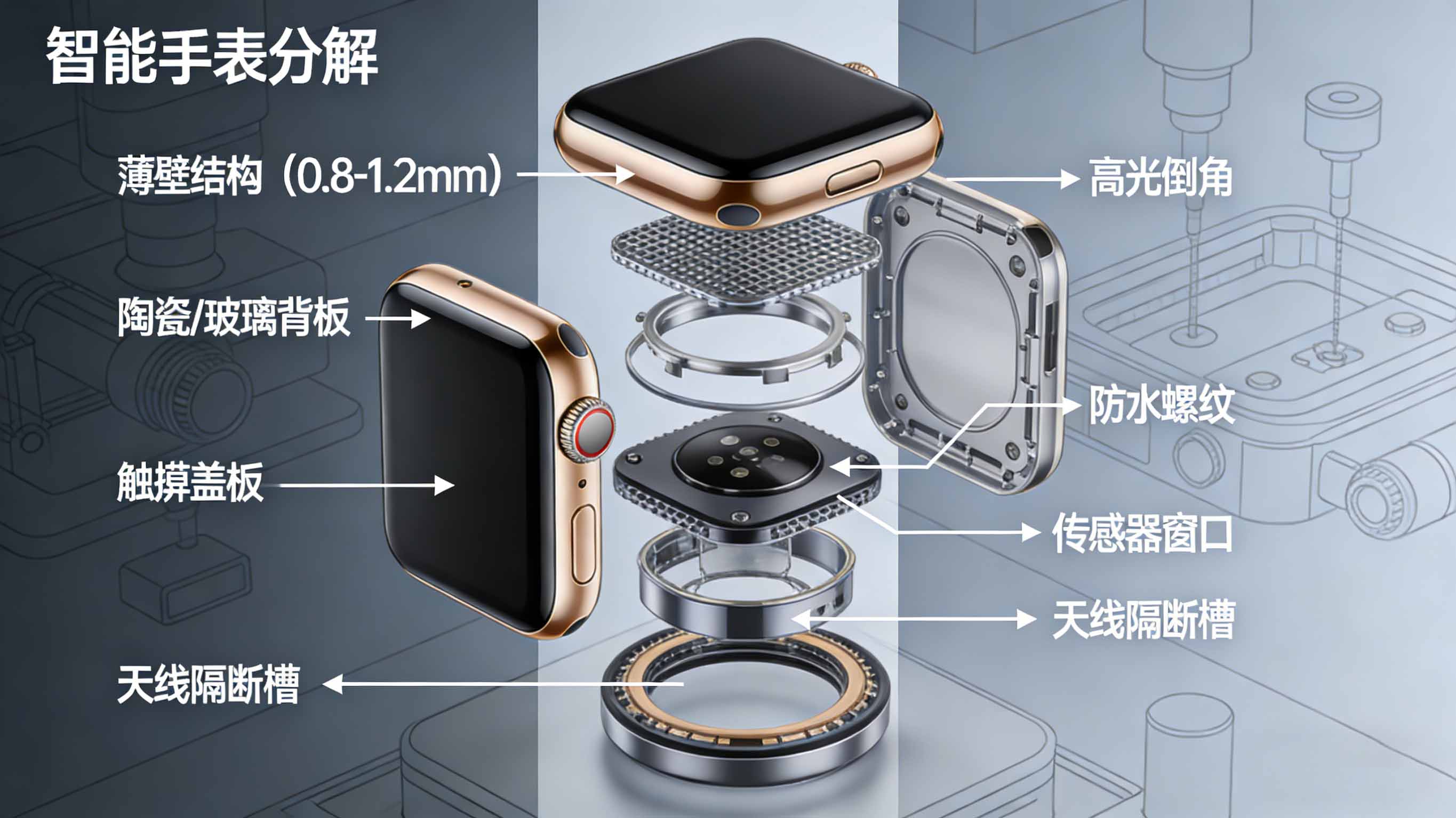 智能手表外壳手板的核心挑战在于如何在微小尺寸上同时实现智能功能集成与精密结构: