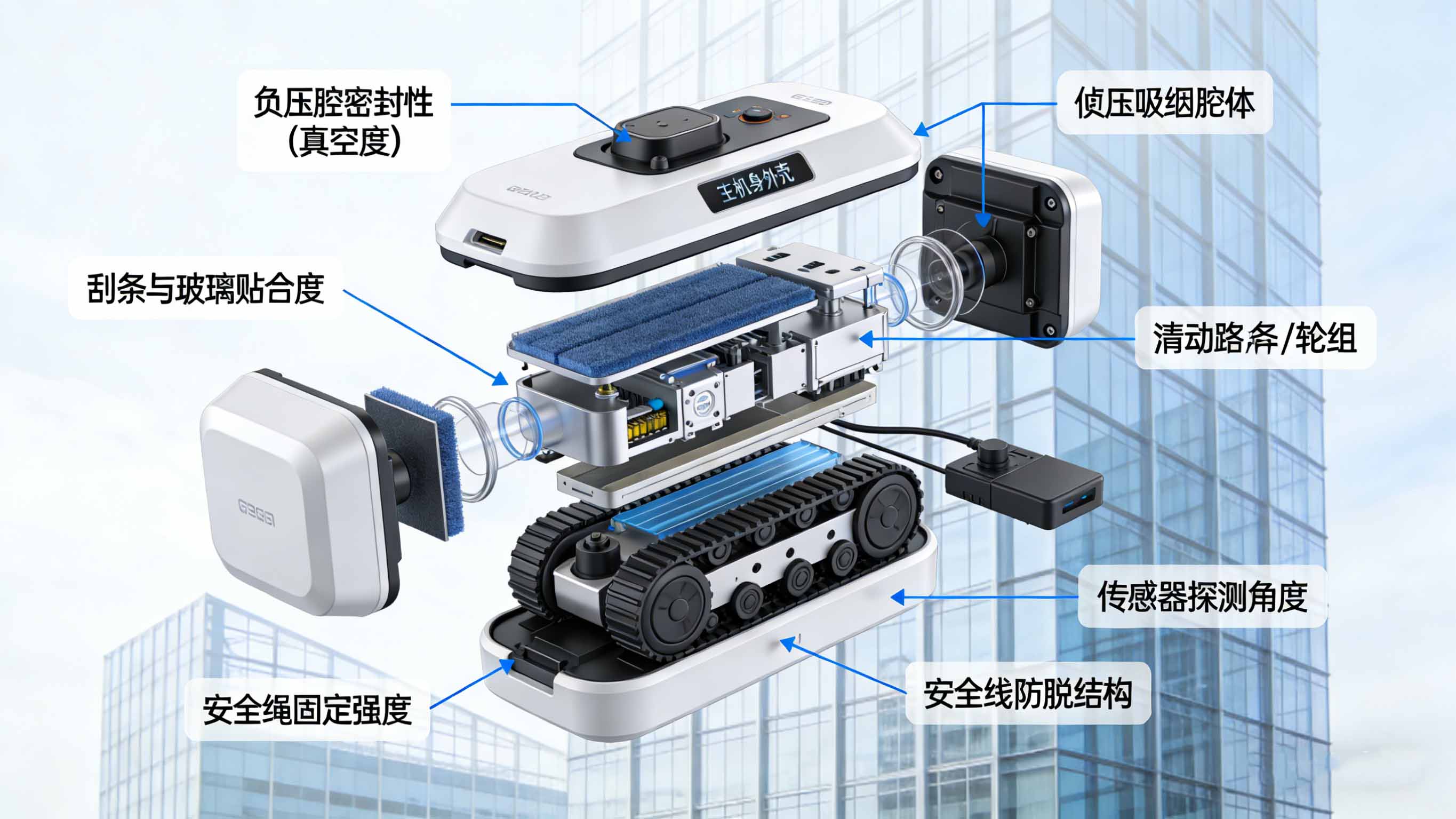 擦窗机器人手板的核心挑战在于如何在确保吸附稳定性的同时实现高空作业的安全性: